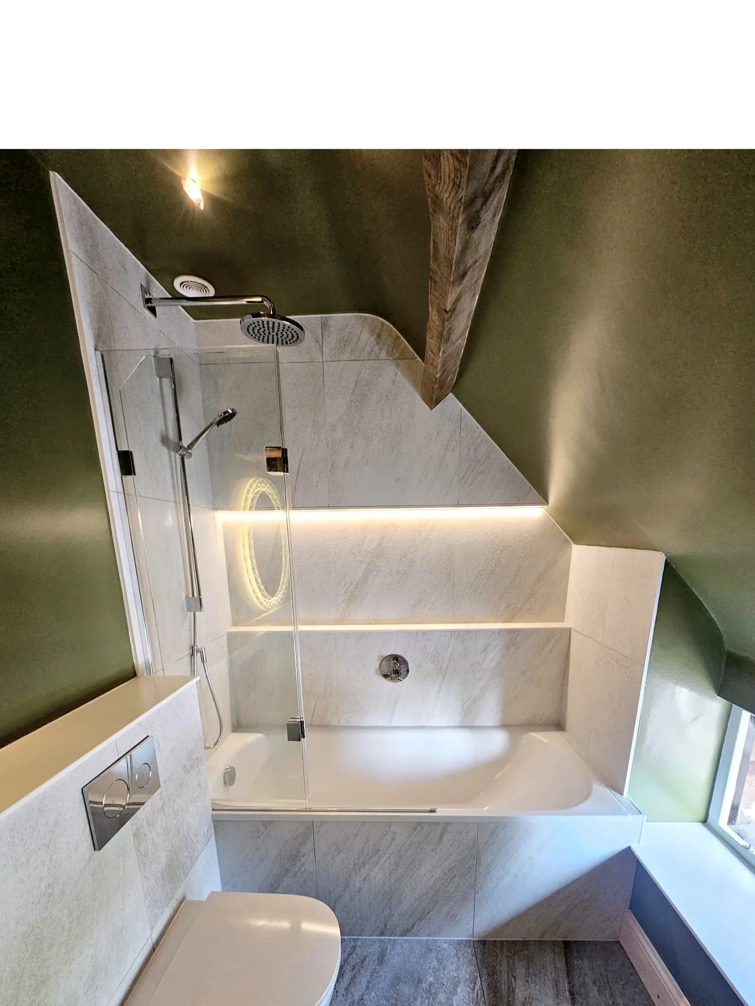 - Concealed cistern and wall-hung toilet, fully tiled in for a sleek, minimalist appearance.